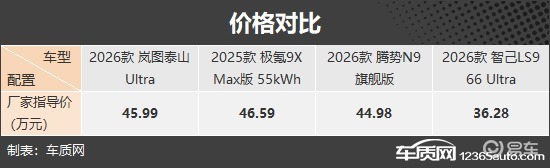 四款车型在动力系统上呈现明显分化。智己LS9是唯一采用增程式动力的车型,其CLTC纯电续航里程表现突出,且定价更具亲和力,成为性价比之选;其余三款均搭载插电式混合动力系统,售价集中在44万至47万元区间。其中,极氪9X与腾势N9配备2.0T发动机,岚图泰山与智己LS9则采用1.5T发动机,但极氪9X的发动机最大功率与腾势N9的电动机总功率在参数上更占优势。