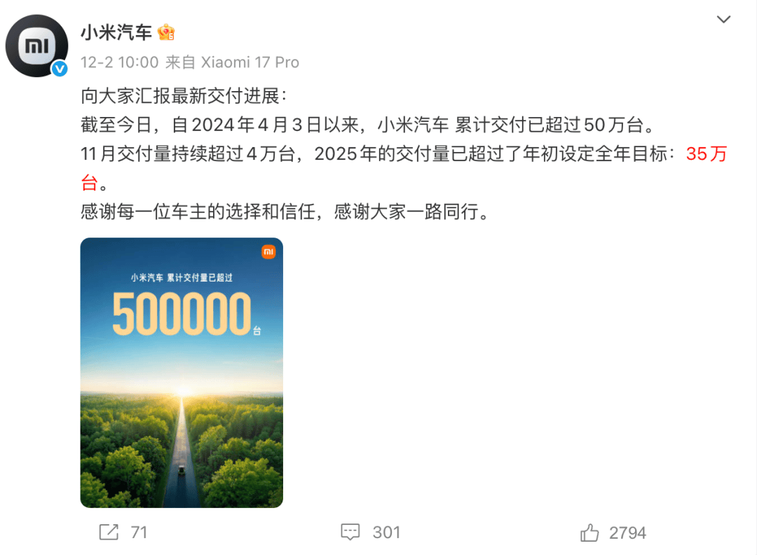 最新数据显示,小米汽车的交付速度进一步加快。截至12月2日,自2024年4月3日启动交付以来,累计交付量已突破50万辆。其中,11月单月交付量连续超过4万辆,提前完成了年初设定的35万辆全年目标。