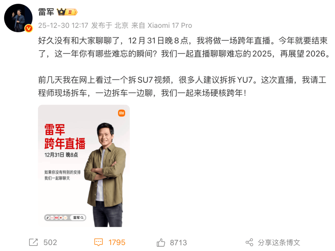 雷军近日在微博上宣布,将于12月31日晚开启一场特别的跨年直播活动。此次直播的亮点之一是现场拆解小米汽车,雷军透露,此前看到网上有拆解SU7的视频,不少网友建议对YU7进行拆解,因此他决定在直播中邀请工程师现场拆车,并同步讲解技术细节,与观众共同度过一个充满科技感的跨年之夜。