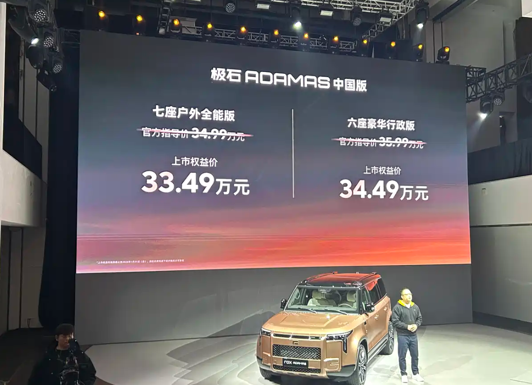作为极石01的改款车型,极石ADAMAS此次共推出两款配置版本,上市权益价分别为33.49万元和34.49万元。新车延续了增程动力系统,并在内饰配置方面进行了显著升级。外观上,ADAMAS保持了硬朗的车身轮廓,方盒子造型与路虎发现4有几分相似,同时融入了更多科技元素。狭长复杂的灯组、黑化悬浮顶以及后挂备胎的设计,进一步强化了其越野风格与视觉冲击力。