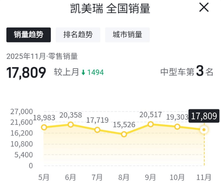 在电动化浪潮席卷汽车市场的当下,一款传统燃油中级车却交出了令人瞩目的成绩单——凯美瑞单月销量突破1.7万辆,在15万-20万元价格区间稳居主流地位。这一现象与行业普遍聚焦的智能电动趋势形成鲜明对比,引发市场对传统燃油车生存空间的重新思考。