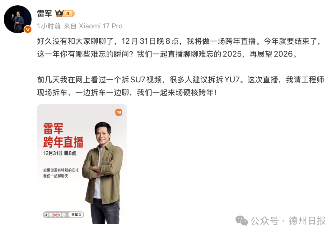 小米科技创始人雷军近日通过社交平台宣布,将于12月31日晚8时开启一场特别的跨年直播活动。此次直播将聚焦汽车领域,为观众带来技术解析与互动体验。