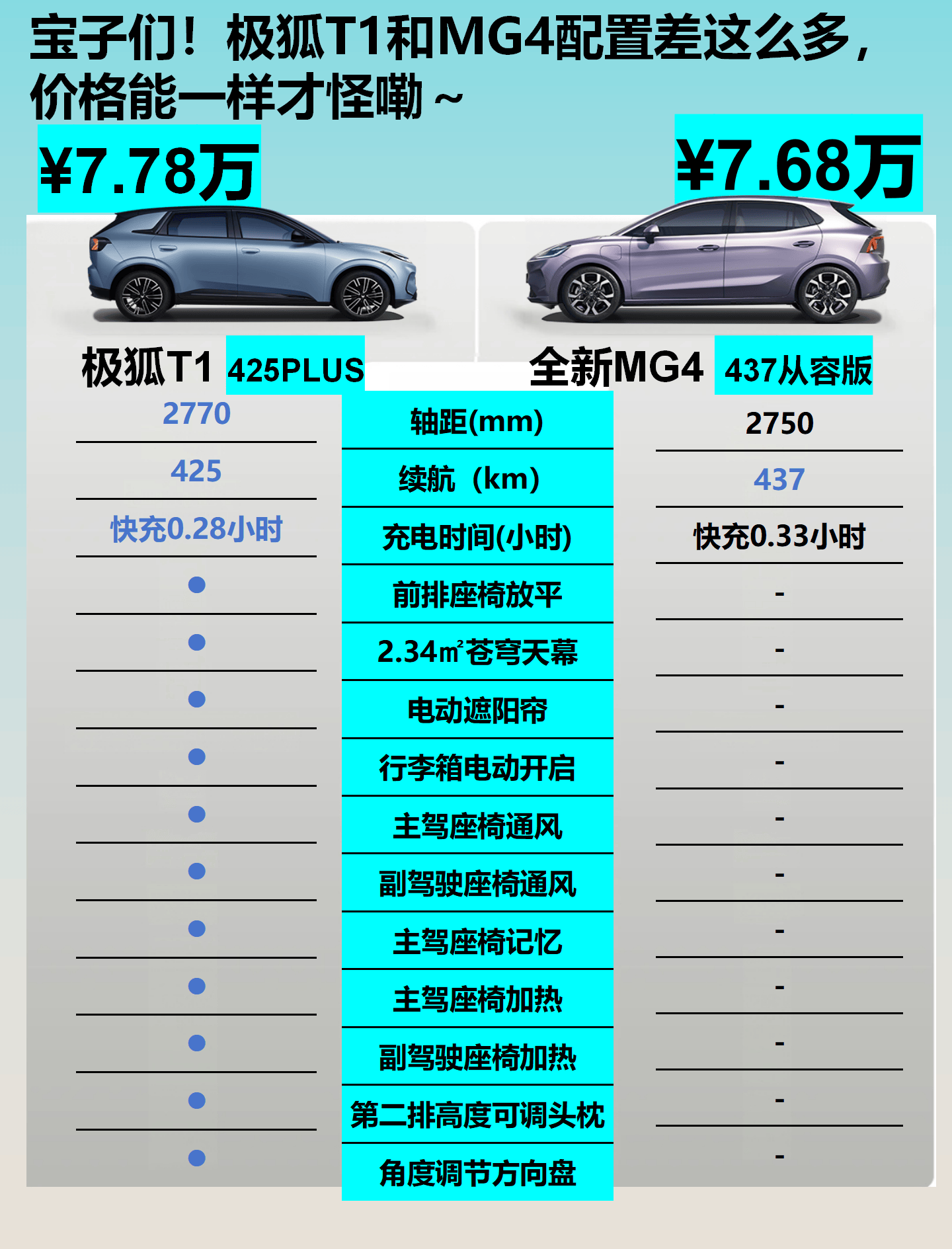 具体到车型选择,极狐T1 425PLUS版本适合注重生活品质的家庭用户,尤其是经常需要多人出行或对车内空气质量有严格要求的消费者。其配置策略类似"精装房"理念,将成本投入在可感知的舒适性、健康性和便利性领域。MG4 437从容版则更适合预算敏感型用户,其品牌历史积淀和基础续航表现,对首次接触电动汽车的消费者具有吸引力。