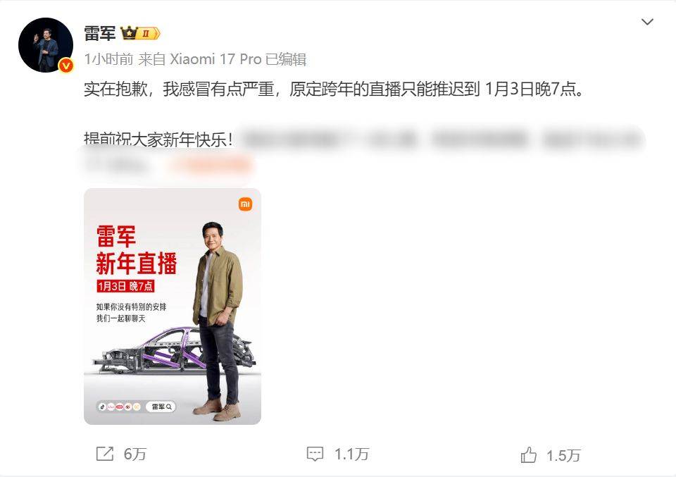 小米集团董事长雷军近日通过社交平台宣布,原定于跨年夜举行的直播活动将延期举行。由于感冒症状加重,他决定将直播时间调整至1月3日晚7点,以便以更好的状态与观众互动。