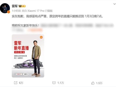 小米科技创始人雷军通过个人社交平台宣布,原定于跨年夜举办的直播活动将延期举行。据其透露,由于近期感冒症状加重,为确保身体状态,决定将直播时间调整至1月3日晚7点。