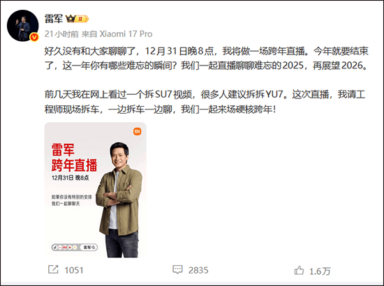 此前雷军曾在社交平台预告,计划于12月31日晚8点开启跨年特别直播,并透露将邀请小米汽车工程师团队现场拆解最新车型YU7。这一安排源于网友对小米SU7拆解视频的热烈讨论,不少用户建议对即将上市的YU7进行类似的技术解析。
