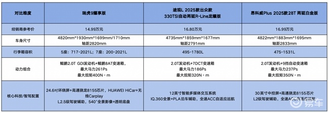 在15万级SUV燃油车市场中,消费者对空间实用性、动力性能以及科技配置的关注度持续攀升。瑞虎9耀享版、途观L 2025出众款330TSI R-Line龙耀版和昂科威Plus 2025款28T两驱白金版,凭借各自特色成为该细分领域的热门选择。本文将从空间表现、动力系统及智能配置三个维度展开对比,为购车决策提供参考。