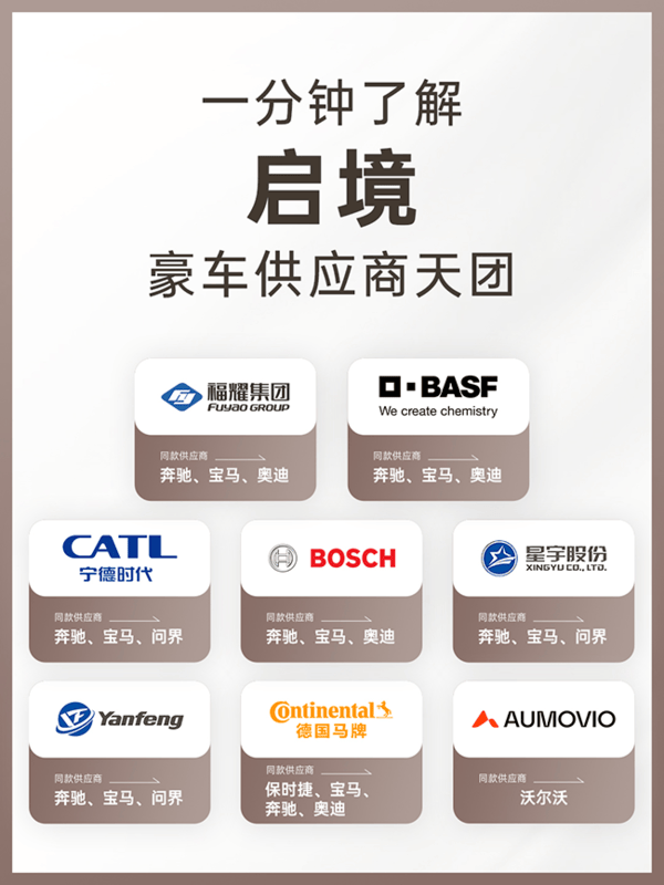 此次启境汽车公布的供应商阵容堪称豪华,华为乾崑、宁德时代、博世、福耀、巴斯夫、星宇、延锋、大陆、马牌等均为各自领域的佼佼者,且这些供应商也是众多百万级豪华车的长期合作伙伴。启境汽车并未简单沿用这些供应商的标准化部件,而是基于高端车型需求,与它们进行联合开发与定制化适配,将传统豪华车的供应链体系进行智能化、电动化重构。