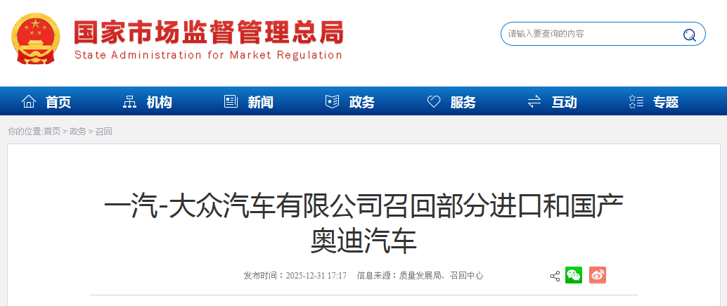 近日,一汽-大众汽车有限公司依据《缺陷汽车产品召回管理条例》及其实施办法,向国家市场监督管理总局提交了召回备案计划,涉及两款不同批次的奥迪系列汽车。