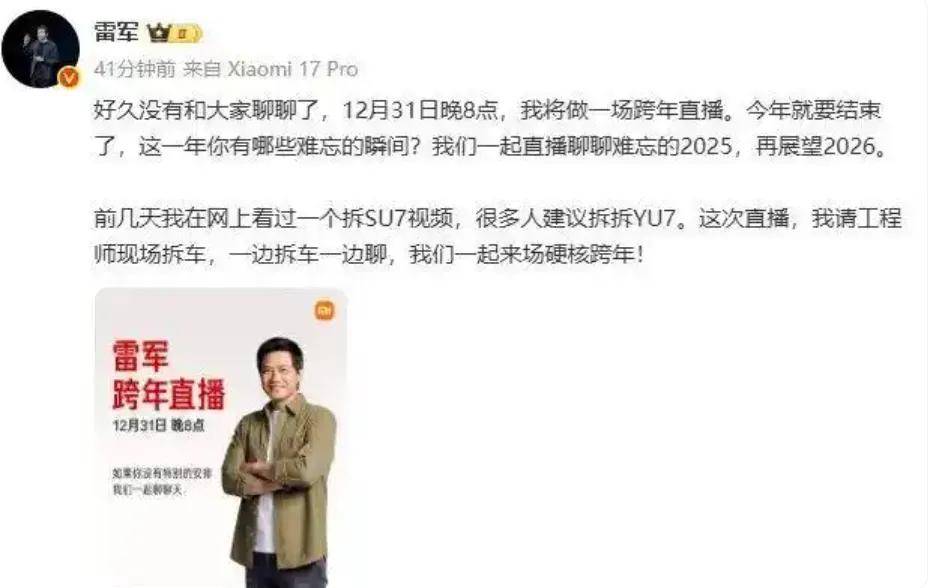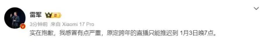 原定于跨年夜举办的雷军直播活动因突发状况延期,引发网友广泛关注。12月31日中午,雷军通过社交平台发布致歉声明,称因感冒导致严重失声,医生强烈要求休息,原定当晚8点的直播将推迟至2026年1月3日晚7点。这条消息发布后迅速登上热搜榜,相关话题阅读量突破2亿次。