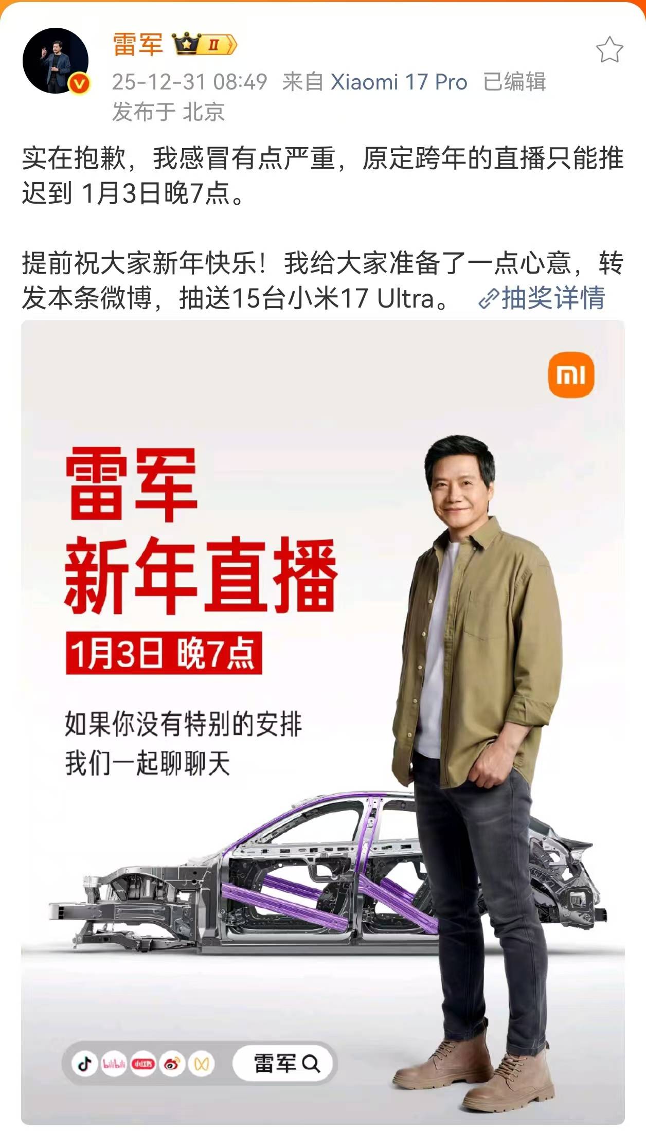 小米集团掌舵人雷军近日通过社交平台向公众发布了一则直播调整通知。原计划于跨年夜当晚开启的直播活动,因突发健康状况不得不延期举行。据其12月31日发布的微博内容显示,这场备受期待的直播将改期至2026年1月3日19时进行。