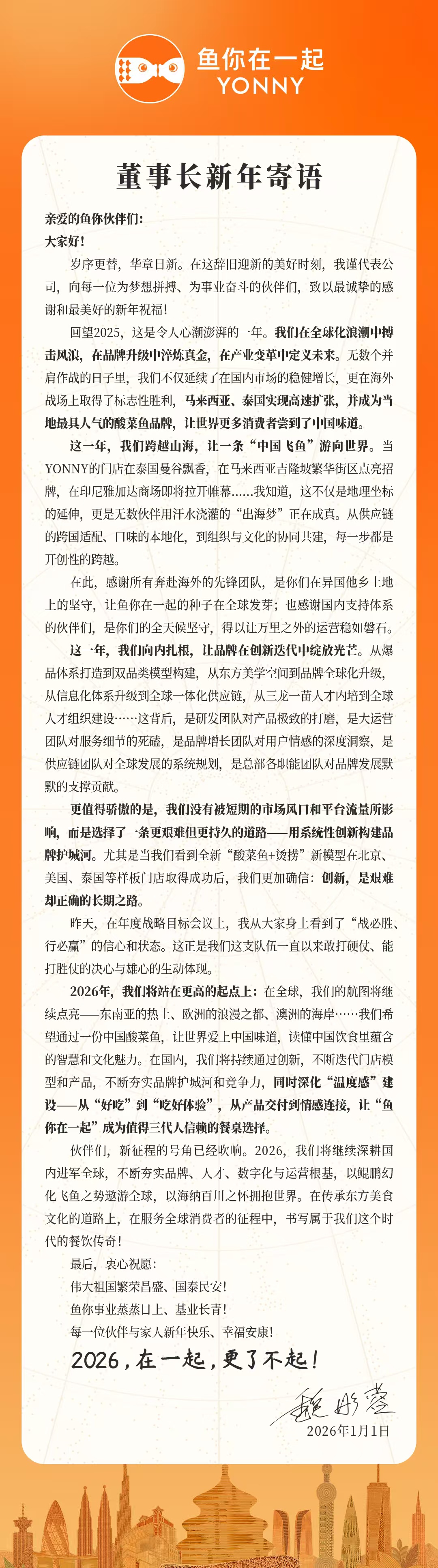 鱼你在一起董事长魏彤蓉在新年之际发布了一封充满激情与展望的寄语,向全球伙伴及消费者传递了品牌发展的最新动态与未来规划。在这封寄语中,魏彤蓉回顾了2025年鱼你在一起在全球化征程中的辉煌成就,并展望了2026年的宏伟蓝图。