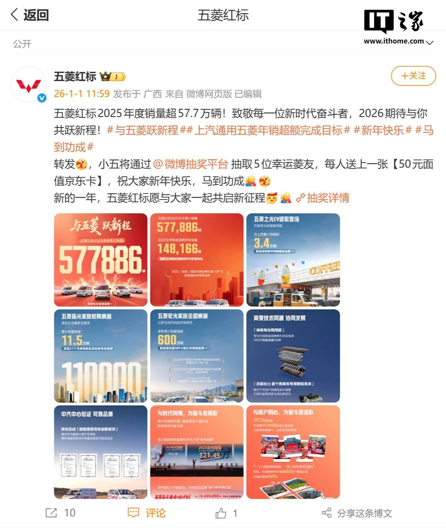商用车方面,五菱红标系列2025年累计销量达577886辆,连续多年蝉联全国商用车销量冠军。其中,新能源商用车累计销量为148166辆,登顶新能源商用车市场销量榜首,并连续10个月实现同比增长超100%。