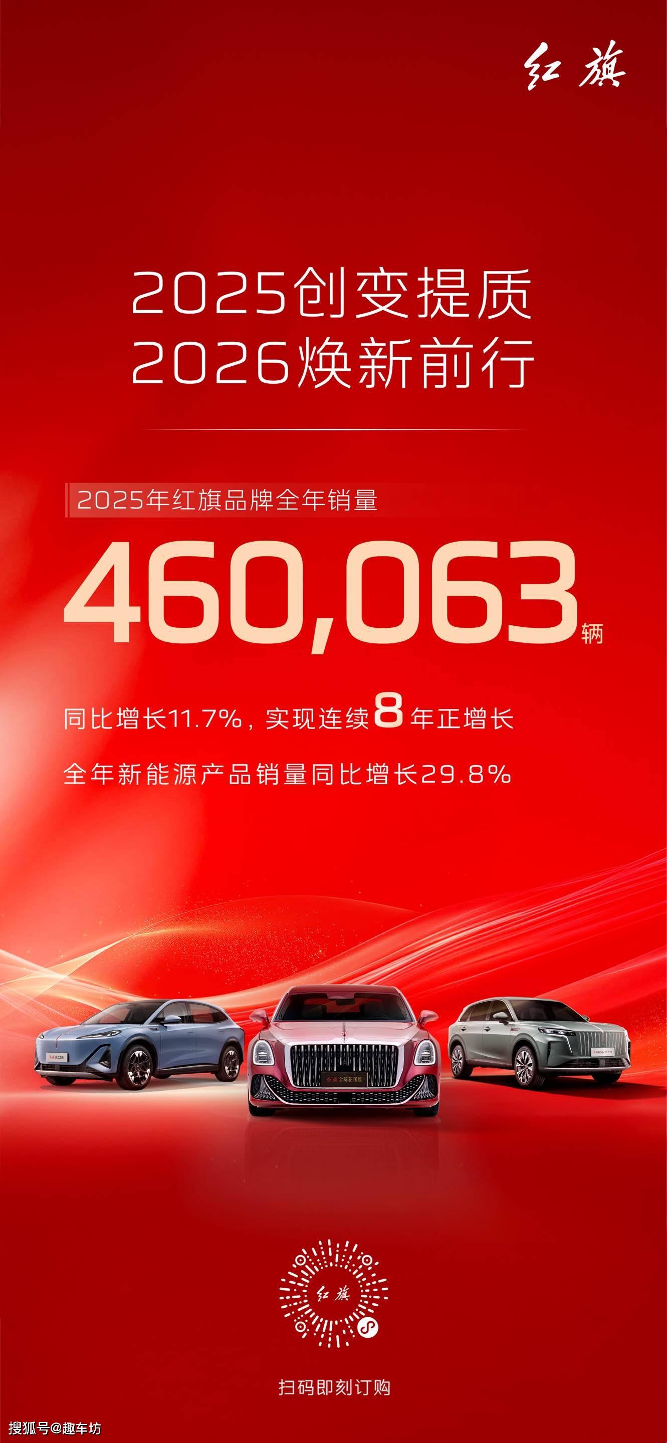 红旗品牌近日交出了一份令人瞩目的年度成绩单:2025年全年销量突破46万辆,同比增长11.7%,连续第八年保持正增长态势,进一步巩固了其在自主豪华品牌领域的领先地位。其中,新能源产品表现尤为亮眼,全年累计销量达14.9万辆,同比增长29.8%,成为推动品牌增长的核心力量。超豪华市场方面,红旗金葵花系列以1,404辆的销量,持续打造具有东方韵味的顶级豪华体验。