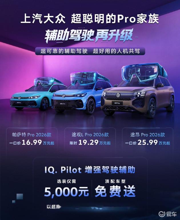在燃油车领域,上汽大众以高阶辅助驾驶为突破口,重新定义了智能化的边界。今年9月,途观L Pro、帕萨特 Pro、途昂 Pro组成的Pro家族2026款车型集体上市,搭载的IQ.Pilot增强驾驶辅助2.0系统成为焦点。该系统不仅实现了高速高架路自主上下匝道、智能避障绕行等高频场景覆盖,更通过“人机共驾”理念解决了传统辅助驾驶系统与用户干预的冲突问题——当驾驶员介入时,系统不会直接退出,而是以柔顺协作的方式提供辅助,兼顾科技感与掌控感。更值得关注的是,上汽大众通过“顶配免费、选装仅5000元”的策略,将高快NOA功能从高端车型下放至主流市场,真正践行了“智能平权”的理念。