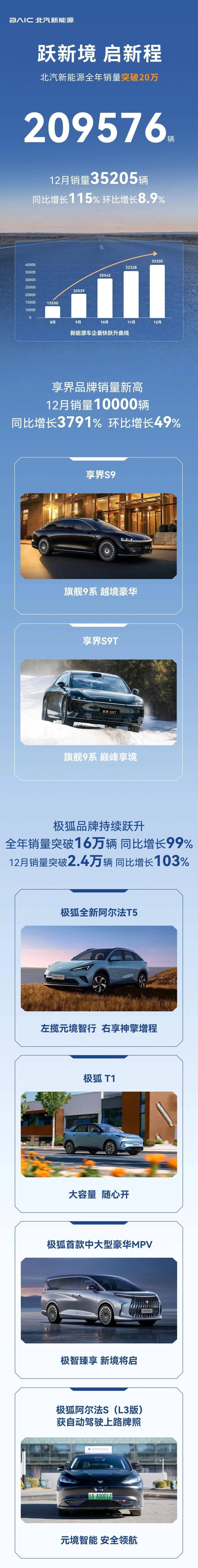 北汽集团旗下新能源企业北汽新能源(又称“北汽蓝谷”)近日公布了2025年销售业绩,全年累计销量突破20万辆大关,达到209576辆,较上一年度增长84%。其中,12月单月销量表现尤为亮眼,以35205辆的成绩实现115%的同比增长,连续三个月保持月销超3万辆的强劲势头。