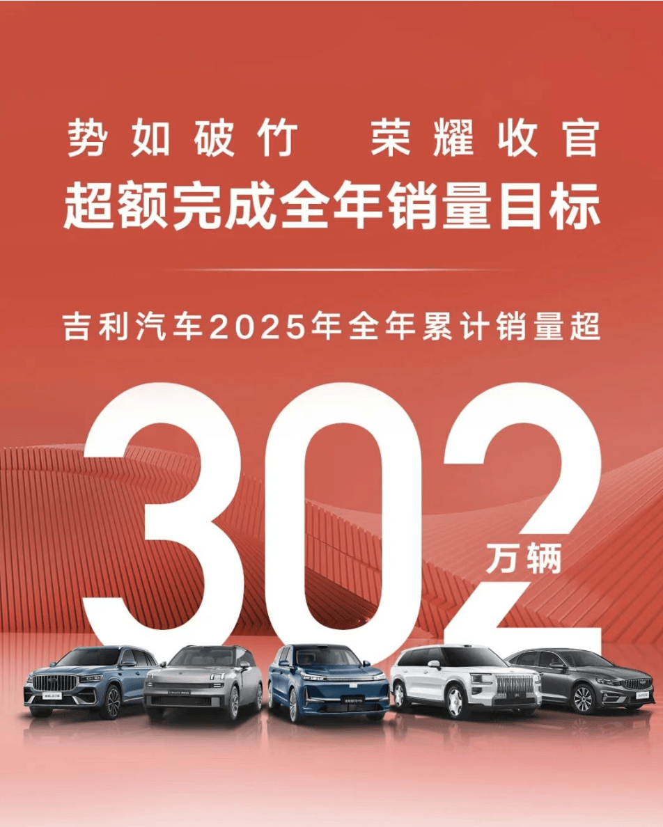 吉利汽车在近日公布的2025年销售成绩单中,交出了一份令人瞩目的答卷。全年累计销量突破302.46万辆,较上一年增长39%,不仅超额完成既定目标,更刷新了历史销售纪录。其中,新能源汽车板块表现尤为亮眼,全年销量达168.78万辆,同比激增90%,同样创下新高。