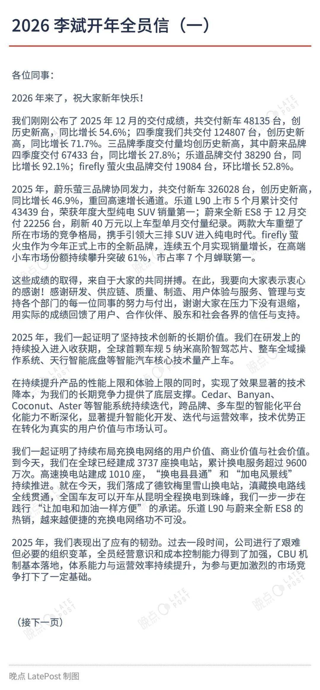 回顾2025年,蔚来交出了一份亮眼的成绩单。全年新车交付量突破32.6万辆,不仅刷新了企业年度交付纪录,更在高端纯电市场保持领先地位。李斌在内部信中特别提到,公司通过组织架构优化和运营效率提升,成功构建了更具韧性的业务体系。过去一年实施的多项改革措施,包括强化成本管控和全员经营意识,已初步显现成效。
