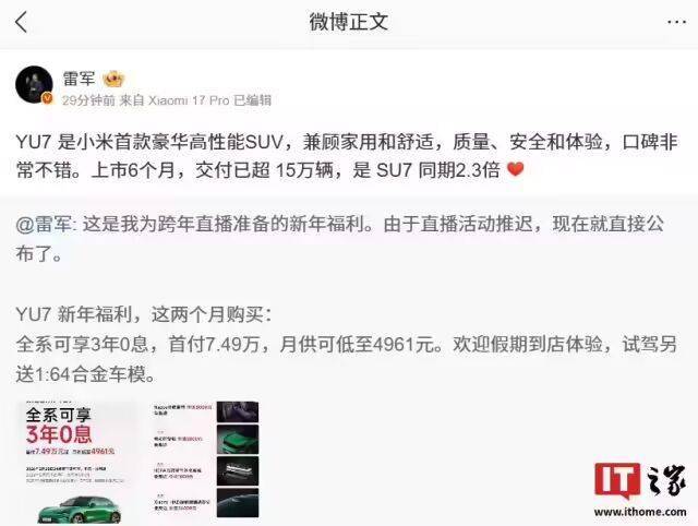 小米汽车近日公布了最新市场成绩,其首款高性能豪华SUV小米YU7在上市短短6个月内,交付量已突破15万辆,这一数据达到同期SU7车型的2.3倍,展现出强劲的市场竞争力。