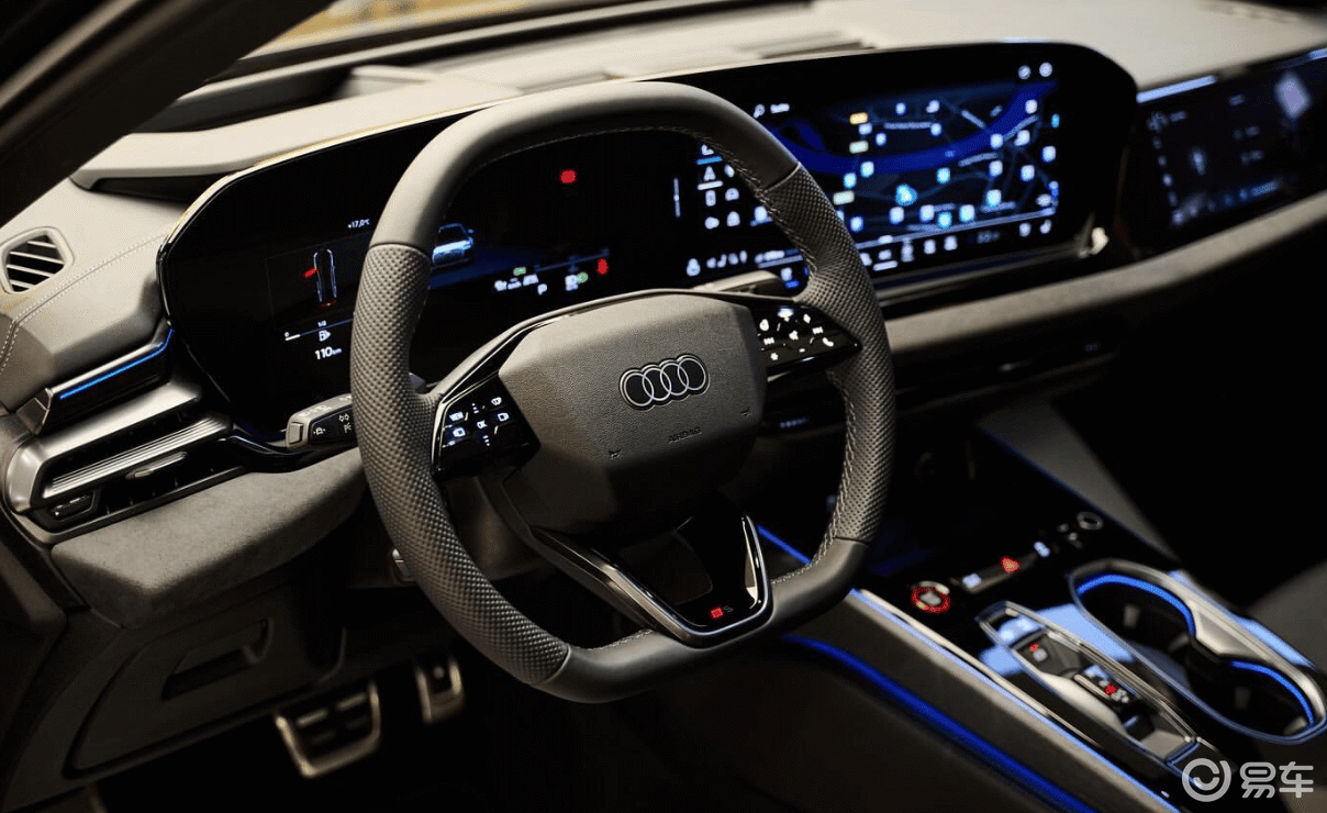 前脸设计成为最大亮点之一,矩阵式LED大灯组采用更狭长的造型,搭配熏黑处理的六边形进气格栅,内部采用蜂窝状镀铬装饰。奥迪四环车标经过扁平化处理后,与两侧运动化导流槽形成呼应。车身侧面通过隐藏式电动门把手和溜背式车顶线条,将整车高度降低15mm,配合首次出现的20英寸花瓣式轮毂,营造出蓄势待发的姿态。尾部采用贯穿式LED尾灯,搭配双边共四出排气装饰和扩散器设计,运动气质得到显著强化。