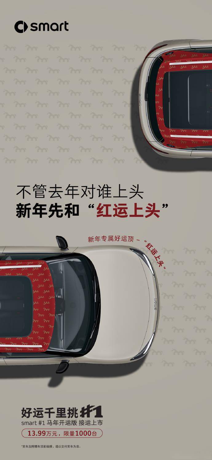smart品牌近日推出全新限量版车型——精灵#1马年开运版,官方指导价13.99万元,全球限量发售1000台。该车型在延续家族设计语言的基础上,通过细节优化与专属配置,打造出兼具节日氛围与科技感的纯电座驾。购车用户可享受包含专属礼遇、服务升级、置换补贴及复购优惠在内的四重权益。