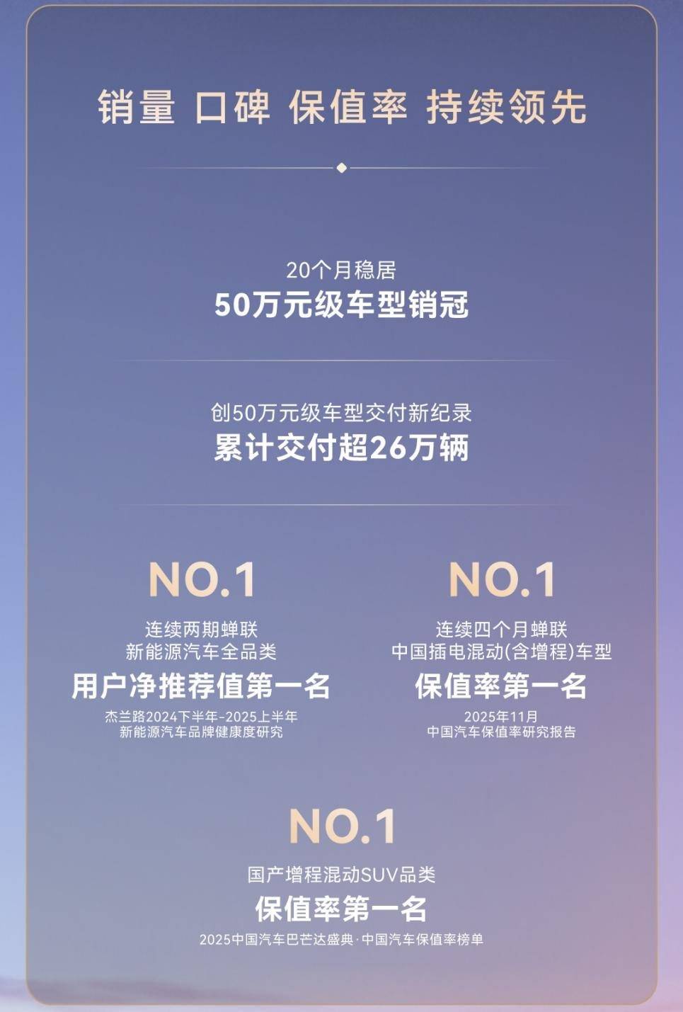 问界M9的“科技豪华”标签源于多重技术加持:华为乾崑智驾ADS 4提供L2+级智能驾驶辅助,途灵底盘实现毫秒级动态响应,鸿蒙智能座舱打造沉浸式交互体验。这些技术共同支撑起其市场统治力——自2023年12月上市以来,该车型在50万以上中国新能源汽车市场占比达70%,每卖出10辆同价位车型就有7辆是M9。更值得关注的是,其用户净推荐值(NPS)与保值率均位列行业第一,连续四个月蝉联中国插电混动(含增程)车型保值率冠军,并在权威机构评测中斩获用户满意度与魅力指数双料第一。