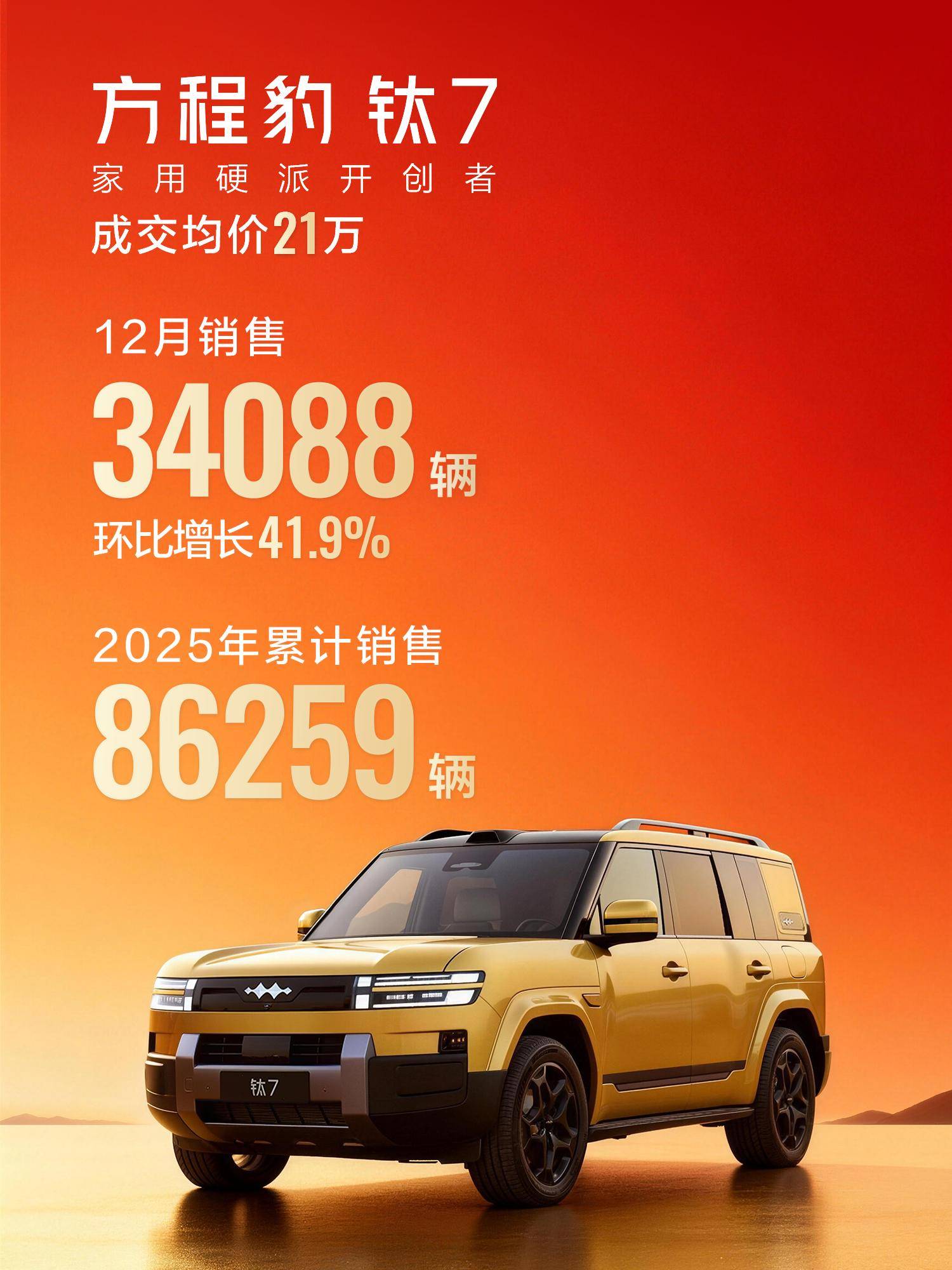 支撑品牌高速增长的核心动力来自其"豹+钛"双系列矩阵的全面发力。定位"家用硬派开创者"的钛7车型成为现象级爆款,12月销量达3.4万台,环比增长41.9%,上市不足四个月累计销量突破8.6万台,成交均价21万元。该车型在混动SUV、方盒子车型细分市场持续领跑,更有望斩获中大型SUV年度冠军,形成"三冠王"的竞争优势。另一款明星车型钛3以"科技潮品开创者"的定位深受年轻群体青睐,单月销量5530台,全年累计突破6.5万台,成交均价15.1万元,持续巩固纯电方盒子市场的领先地位。