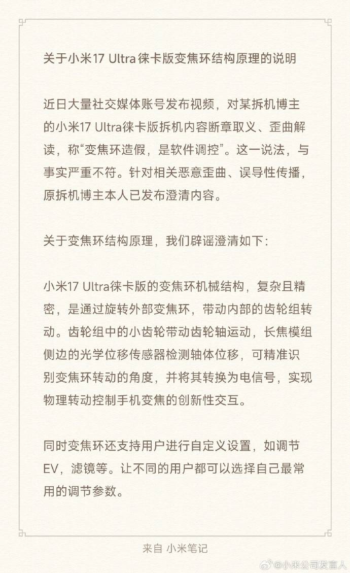 针对近期社交媒体上关于小米17 Ultra徕卡版变焦环的争议,小米公司通过官方渠道发布技术说明,澄清该机型采用纯机械结构实现变焦功能,驳斥了“软件造假”的谣言。公司强调,外部变焦环通过精密齿轮组驱动内部光学位移传感器,将物理转动转化为电信号控制焦距变化,同时支持用户自定义调节EV、滤镜等参数,实现专业级交互体验。