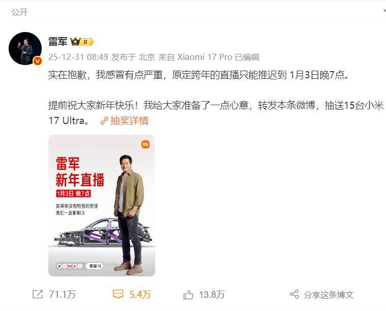 原定于2025年12月31日举办的雷军跨年直播因故推迟至1月3日晚间,据透露直播中将展示工程师现场拆解小米YU7电动车。这一安排延续了小米通过技术展示强化品牌信任的策略,此前雷军曾多次通过直播形式与用户互动,此次拆车环节或为电动车业务造势。