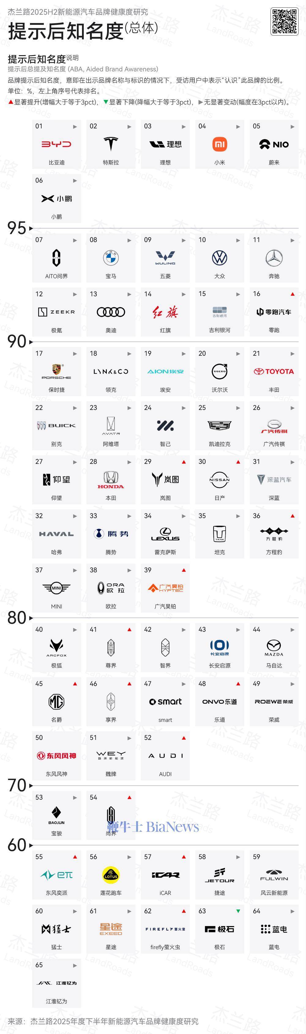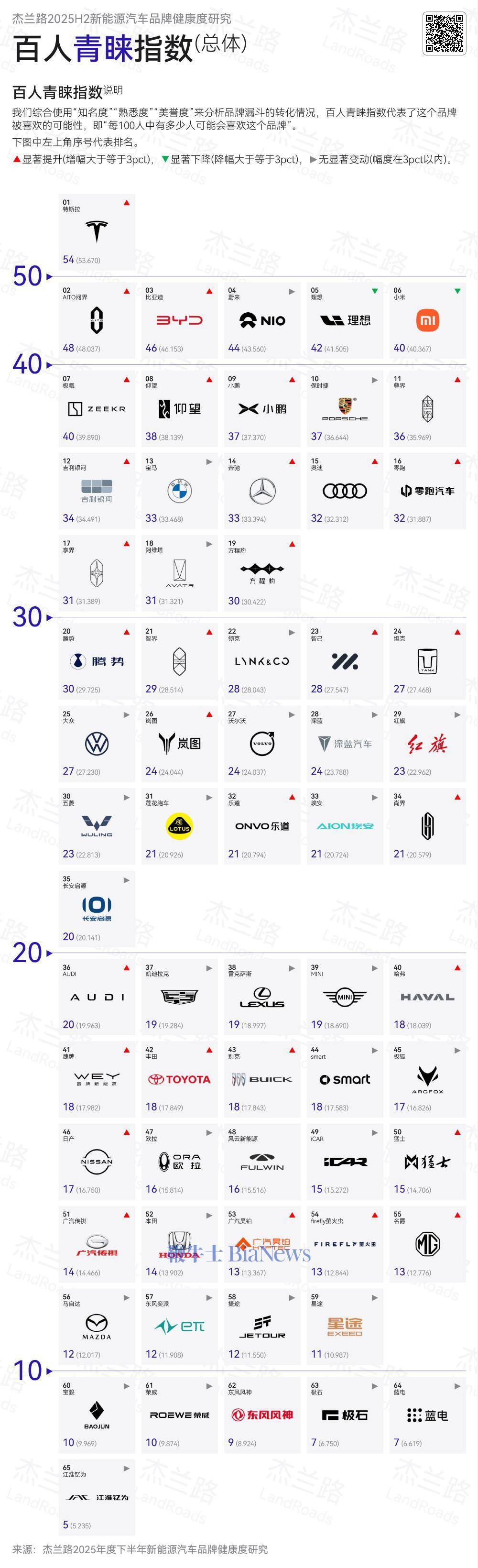 知名调研机构杰兰路近日公布了2025年度下半年新能源汽车品牌健康度研究报告。此次调研范围广泛,共涉及65个新能源汽车品牌,所有数据和观点均源自调研期间受访用户的直接反馈。