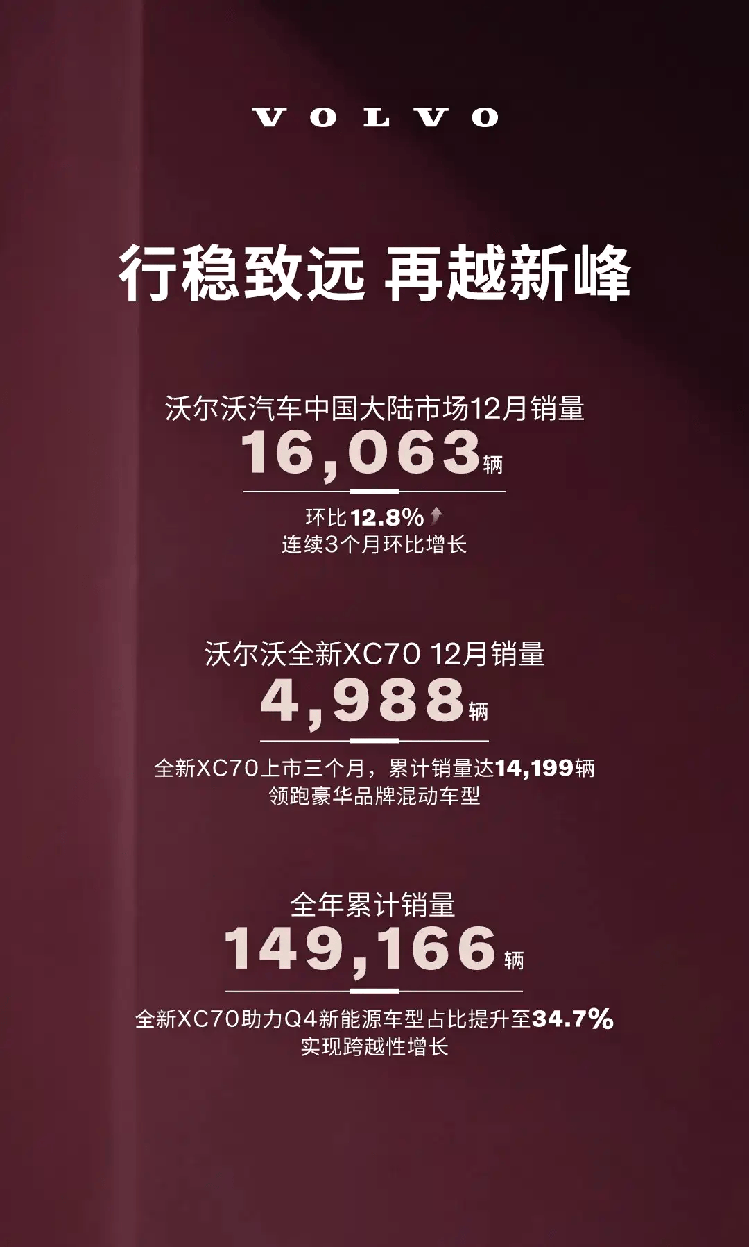 沃尔沃汽车近日公布了最新销售数据,12月单月销量达到16063辆,较上月增长12.8%,全年累计销量突破14.9万辆。其中,全新XC70车型表现尤为亮眼,单月售出4988辆,上市三个月累计销量已达14199辆,成为品牌旗下最畅销车型。
