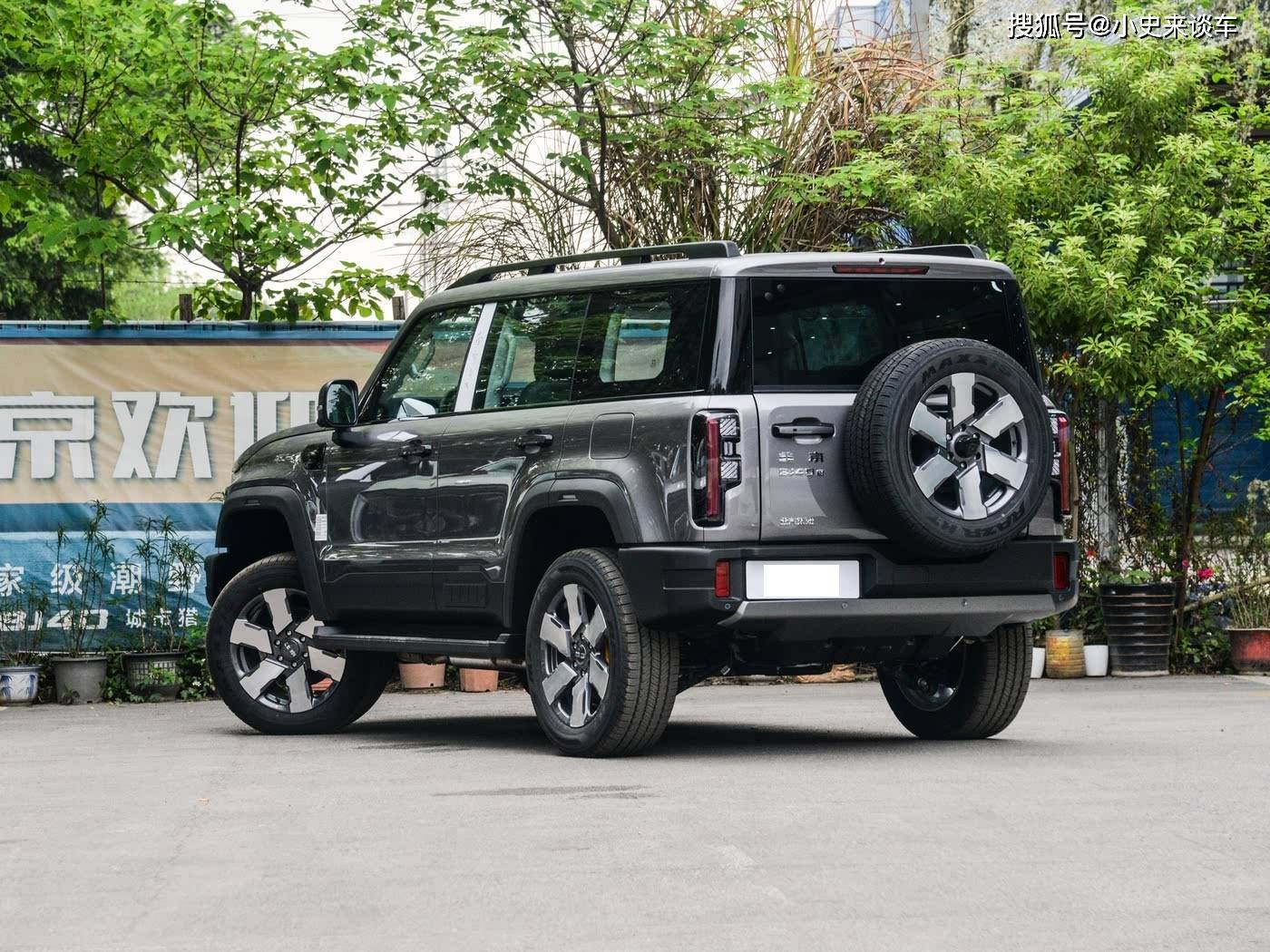 内饰空间通过科技配置实现全面升级,中控屏与副驾屏尺寸从12.8英寸扩大至15.6英寸,搭载高通骁龙8155芯片确保系统流畅运行。绿野仙踪与破晓霞光两种内饰主题,为硬派越野车注入时尚气息。车尾设计保持硬派简约风格,全尺寸外露式备胎与侧开式分体尾门形成经典组合,分段开启功能便于装卸大型装备。贯穿式LED尾灯经过熏黑处理,与银色护板和双边共两出排气形成视觉呼应,小型扰流板的加入则优化了空气动力学表现。