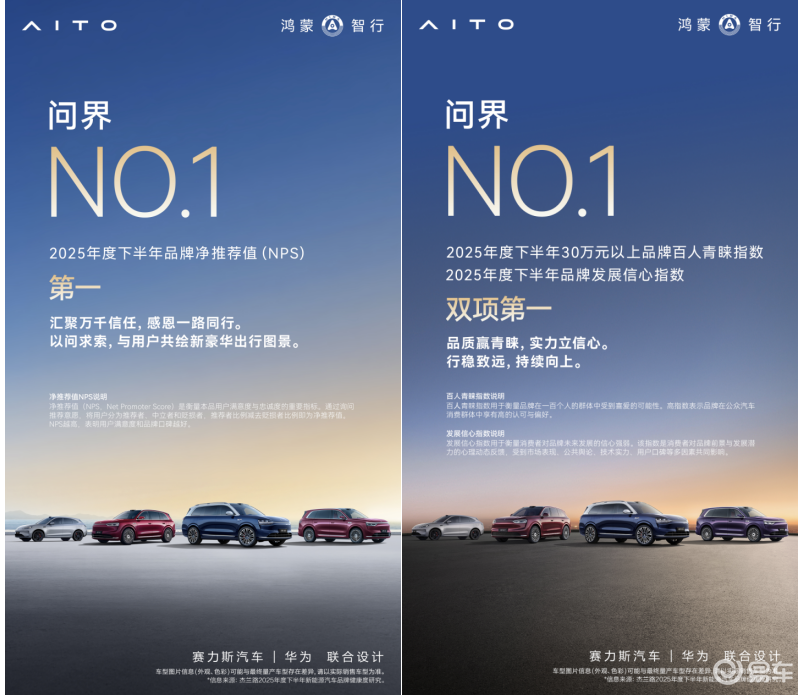 近日,杰兰路咨询发布的《2025下半年新能源汽车品牌健康研究报告》引发行业关注,问界品牌凭借卓越表现成为焦点。该品牌不仅在品牌NPS(净推荐值)榜单中拔得头筹,还在品牌发展信心指数和30万元以上品牌百人青睐指数方面双双登顶,旗下两款旗舰车型也在车型NPS评选中斩获佳绩,充分彰显其在高端新能源赛道的领军实力。