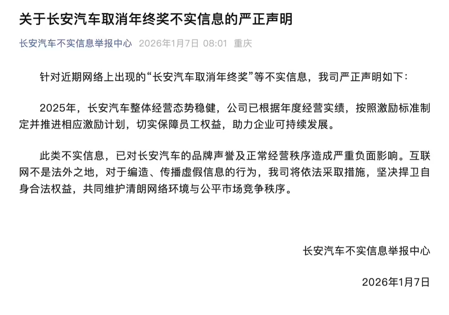 长安汽车近日通过其官方公众号“长安汽车不实信息举报中心”发布公告,针对近期网络流传的“长安汽车取消年终奖”等不实信息作出正式回应。公司表示,此类虚假信息已对其品牌形象及正常运营造成显著负面影响。