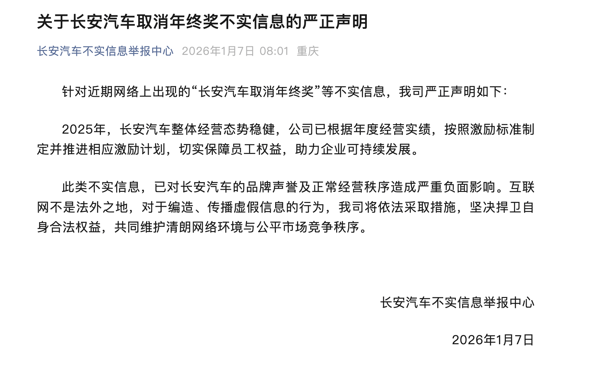 长安汽车近日针对网络流传的“取消年终奖”传闻作出正式回应。公司通过官方信息平台发布声明,强调2025年经营状况保持稳健发展态势,并已根据实际经营成果制定并实施员工激励计划,确保员工权益与企业发展形成良性互动。