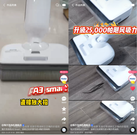 做好短视频和直播场域经营,是海尔洗地机品牌拉新种草的有效手段。在人群目标上,海洗地机尔紧扣35-40岁品牌核心人群内容消费偏好,在短视频创作方面主打多维度覆盖与灵活创新。通过在厨房重油污、客厅干湿垃圾散落等真实家庭生活场景中,展示产品核心功能,海尔洗地机将晦涩难懂的技术参数转化为可视化的解决方案,帮助用户轻松理解产品价值。同时,海尔洗地机积极尝试将产品内容嫁接全网热点与高流量视频模版、进行达人素材二创,以此触达更广阔的用户群体。