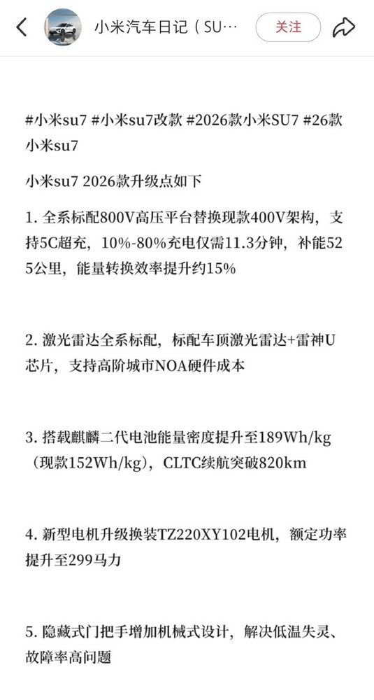 在动力系统方面,新一代SU7全系标配800V高压平台,取代了现款的400V架构。这一升级使得车辆支持5C超充技术,仅需11.3分钟即可将电量从10%充至80%,续航里程增加525公里,能量转换效率提升约15%。同时,车辆搭载的麒麟二代电池能量密度提升至189Wh/kg,较现款的152Wh/kg有显著提升,CLTC工况下续航里程突破820公里。新型TZ220XY102电机的额定功率提升至299马力,为车辆提供更强劲的动力输出。
