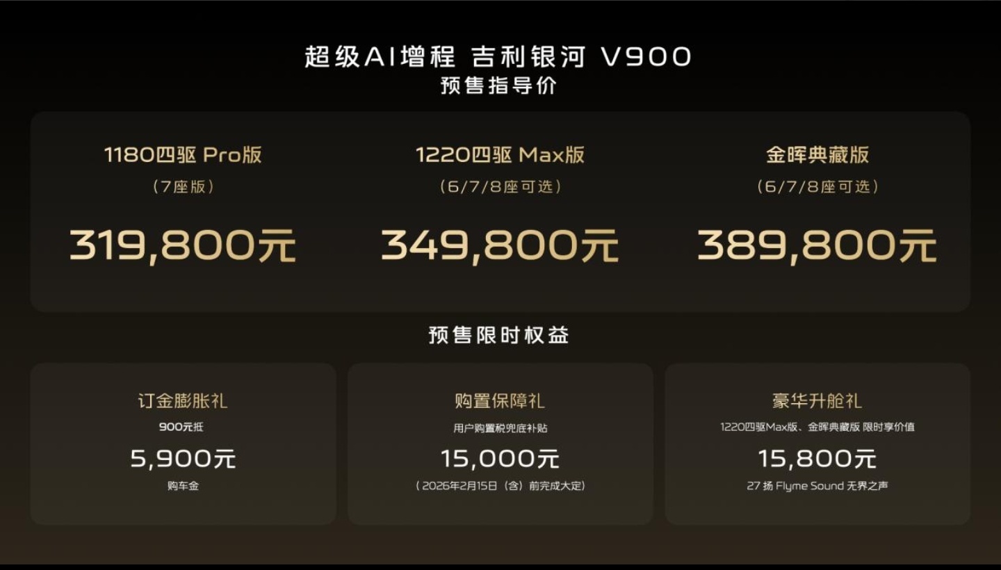 吉利银河V900近日正式开启预售,作为吉利银河V系列的首款车型,此次共推出3个版本,预售指导价区间为31.98万元至38.98万元。这款新车凭借其出色的空间表现、丰富的舒适配置以及领先的智能科技,迅速成为市场关注的焦点。
