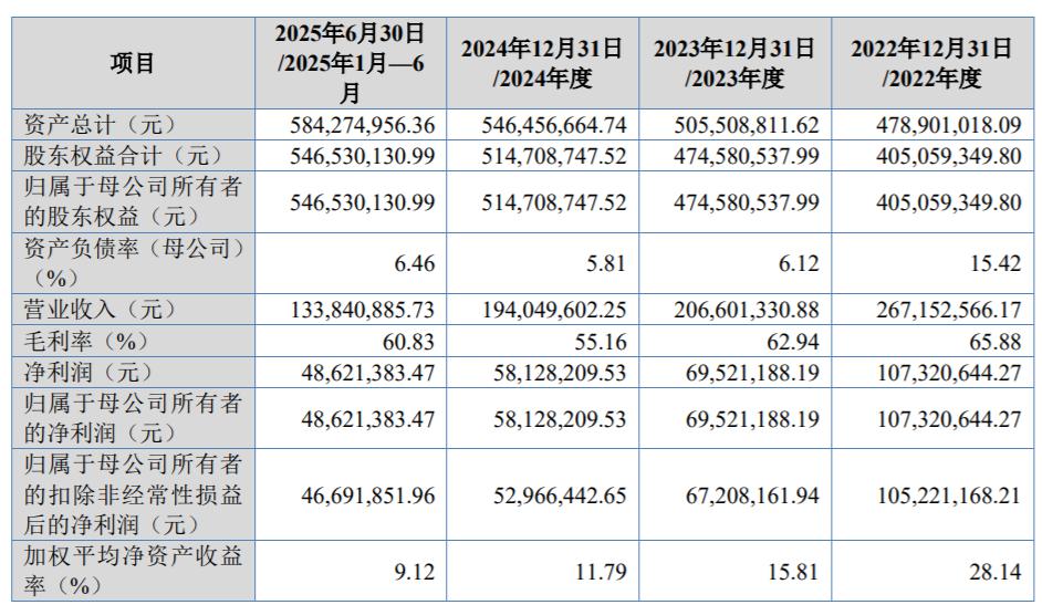 从财务数据来看,文峰光电在报告期内(2022年至2024年及2025年上半年)的营业收入和净利润经历了一定的波动。具体而言,2022年营业收入为2.67亿元,净利润为1.07亿元;而到了2023年,营业收入下降至2.07亿元,净利润也降至6952.12万元,同比下滑幅度分别达到22.67%和35.22%。2024年,公司继续面临挑战,营业收入和净利润分别进一步下滑至1.94亿元和5812.82万元,同比降幅为6.08%和16.39%。