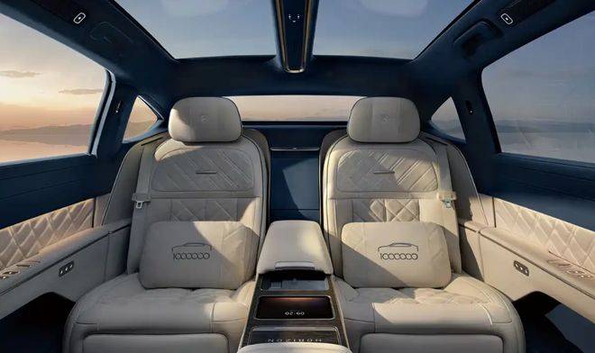 进入车内,ET9限量版呈现出一种奢华而科技感十足的氛围。四座布局搭配独特的“行政桥”设计,将前后排空间巧妙分隔。这条近两米长的贯通结构内集成了电动智能冰箱等高端配置,既实用又彰显身份。后排座椅采用360度无极调节设计,配备独立显示屏和控制屏,为乘客提供极致的舒适体验。矩形方向盘、AR抬头显示以及流媒体后视镜等科技配置的加入,进一步提升了整车的未来感。