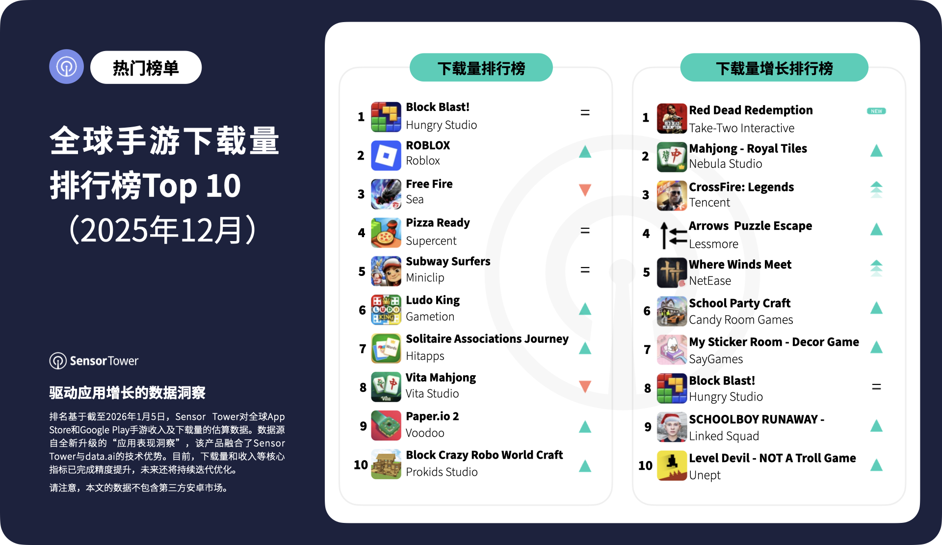 在下载量方面,《Block Blast!》登顶2025年12月全球手游下载榜。《ROBLOX罗布乐思》位居第2,《Free Fire》《Pizza Ready!》和《Subway Surfers》跻身前五。《Block Blast!》以简单的低门槛解谜机制和扩张的运营活动节奏稳居全球第1,12月限时活动数量较11月翻番,通过主题关卡和收藏奖励维持全球广泛受众参与度。《ROBLOX》继续受益于用户生成内容(UGC)和创作者驱动的体验,12月因SKZOO游戏内音乐会(联动K - pop组合Stray Kids)等活动提升参与度,引入主题音乐内容和可收藏的UGC道具,驱动粉丝发现与社交互动。