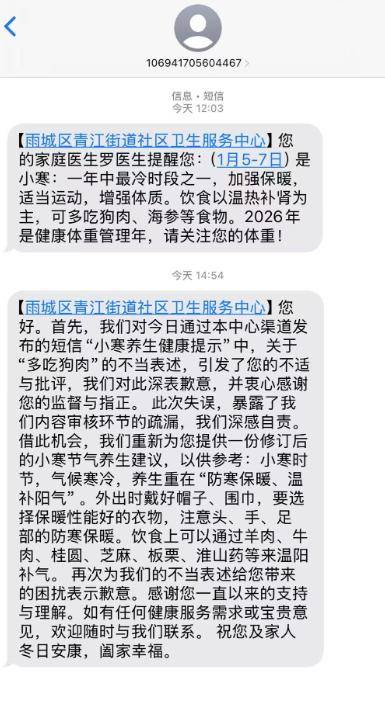 随后,该中心向市民发送了致歉短信,承认内容审核存在疏漏,并对不当表述深表歉意。致歉短信中写道:“我们对今日通过本中心渠道发布的短信‘小寒养生健康提示’中,关于‘多吃狗肉’的不当表述,引发了您的不适与批评,我们对此深表歉意,并衷心感谢您的监督与指正。”