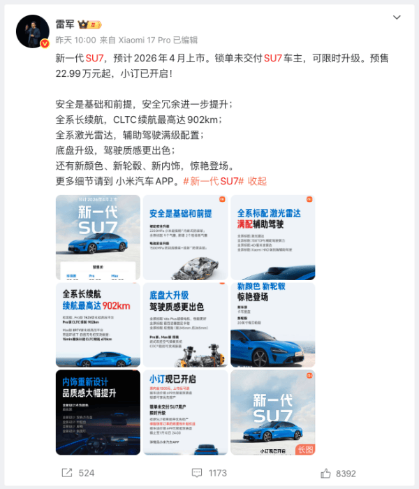 小米汽车即将推出新一代SU7车型,雷军通过社交媒体宣布,新车预计于2026年4月正式上市。作为品牌升级后的首款产品,新一代SU7在安全性、智能化和性能配置上实现全面突破,预售价定为22.99万元,较现款车型上涨1.4万元,但仍低于特斯拉Model 3的起售价。