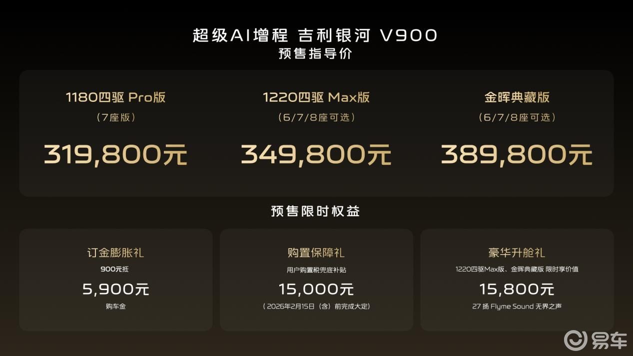 吉利银河V900正式开启预售,推出三款车型,预售价格区间为31.98万元至38.98万元。这款定位家庭旗舰的MPV车型,以“全球最大空间”为核心卖点,通过创新设计与技术突破,重新定义了豪华MPV的价值标准。