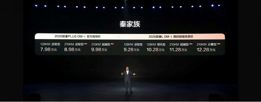 2026年开年,比亚迪以两款全新车型在新能源车市场投下重磅炸弹。1月8日,2026款秦PLUS DM-i与秦L DM-i长续航版正式上市,凭借210km(CLTC)的纯电续航能力,重新定义了A级/A+级插混轿车的价值标准。其中,秦PLUS DM-i 210KM版以8.98万元的起售价杀入市场,而配置更丰富的秦L DM-i 210KM版则定价11.28万元,这一价格策略直接将长续航插混车型的门槛拉低至主流消费区间。