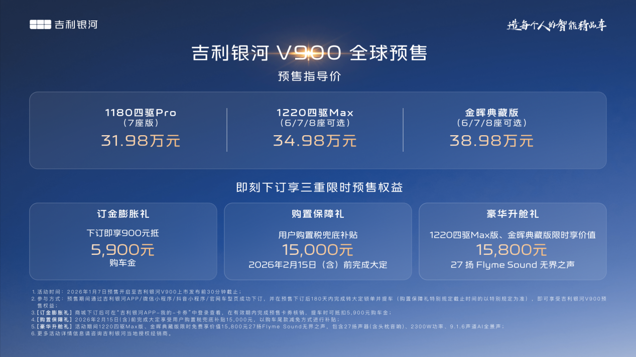 吉利银河V系列首款车型——吉利银河V900正式开启预售,这款被定义为“AI全场景家庭旗舰MPV”的新车共推出3个版本,预售价格区间为31.98万元至38.98万元。作为一款专为中国大家庭出行需求打造的车型,吉利银河V900以宽奢空间、豪华驾控、全维安全和AI智能四大核心优势,重新定义了豪华旗舰MPV的价值标准,为用户带来全新的出行体验。