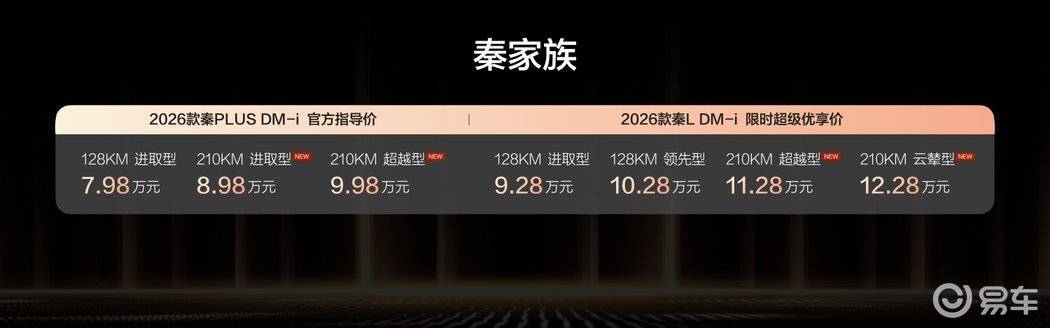 比亚迪秦家族近日迎来重大升级,2026款秦L DM-i与秦PLUS DM-i 210KM长续航版双车同步上市,以8.98-12.28万元的价格区间重新定义插混家轿市场。其中,秦L DM-i 210KM长续航版限时优享价11.28-12.28万元,秦PLUS DM-i 210KM长续航版售价8.98-9.98万元,两款车型均推出多重购车权益,为消费者带来超值选择。