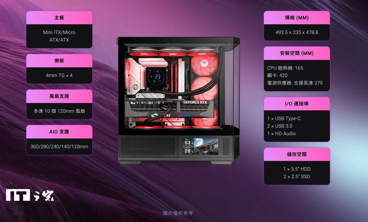 散热系统支持最多安装 10 个 120mm 风扇,并兼容 360mm 一体式水冷排。显卡安装方式突破传统限制,支持竖插布局以更好展示显卡外观。用户还可选配 6 英寸 LCD 屏幕模块,实现硬件状态监控或个性化内容显示,进一步拓展机箱功能边界。