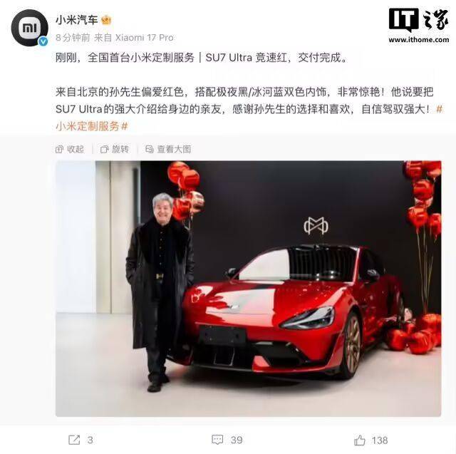 小米汽车近日宣布,全国首台通过小米定制服务打造的车型——SU7 Ultra 竞速红已正式交付车主。这款车型凭借独特的外观设计与个性化配置,引发了市场广泛关注。