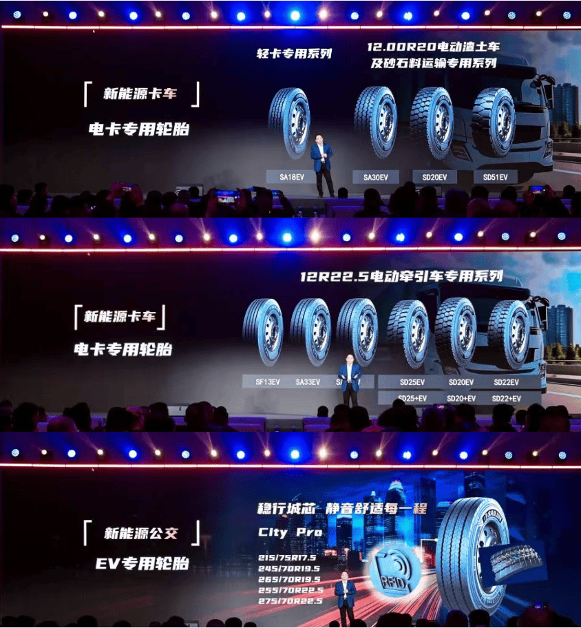随着新能源商用车市场的快速发展,赛轮集团紧跟行业趋势,专门为新能源卡车及公交推出了EV专用产品系列。这一系列涵盖了多种专用轮胎,其中轻卡专用SA18EV轮胎,专为轻卡车型设计,能够满足其日常运输需求;电动渣土车专用系列包括SA30EV、SD20EV、SD51EV等型号,针对电动渣土车的工作特点,在耐磨性、承载能力等方面进行了优化,可适应复杂的作业环境。